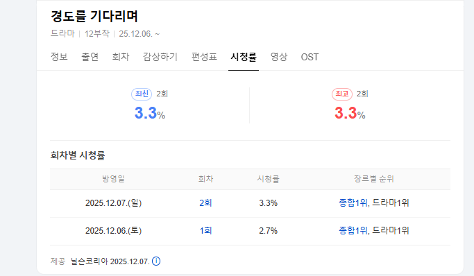 | 12.07 (일) | 2회 | 3.3% | 종합 1위, 드라마 1위 |